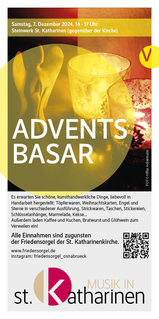 Unser diesjähriger Basar zugunsten der Friedensorgel findet am 7. Dezember 2024, dem Samstag vor dem zweiten Advent, statt. An diesem Tag können Sie zwischen 14:00 und 17:00 Uhr bei uns Kaffee und Kuchen, aber auch Punsch und Würstchen genießen und dabei in unserem vielfältigen Angebot mit Sicherheit etwas Schönes zum Verschenken oder zum selber Behalten finden. Es warten viele liebevoll gestaltete handwerkliche Dinge auf Sie: Töpferwaren, Stricksachen, Sterne, Engel und andere Figuren, selbst gebackene Kekse, bedruckte Taschen und Servietten, Schlüsselanhänger, Marmelade, Weihnachtskarten und anderes mehr. Genießen Sie bei uns einen adventlichen Nachmittag im Saal des Steinwerkes, gönnen Sie sich etwas Schönes und Weihnachten kann kommen!