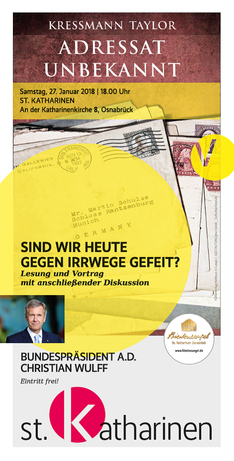 Schüler und Schülerinnen des Ratsgymnasiums lesen aus dem Buch „Adressat unbekannt“ von Kressmann Taylor. Bundespräsident a.D. Christian Wulff spricht zum Thema „Sind wir heute gegen Irrwege gefeit?“ mit anschließender Diskussion.