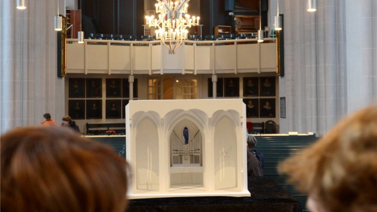 Die Gemeinde St. Katharinen präsentierte am Sonntag ein Modell der Friedensorgel, die bis 2018 in ihrer Kirche gebaut werden soll. Orgelbauer Metzler und andere erklärten Details des Neubaus.